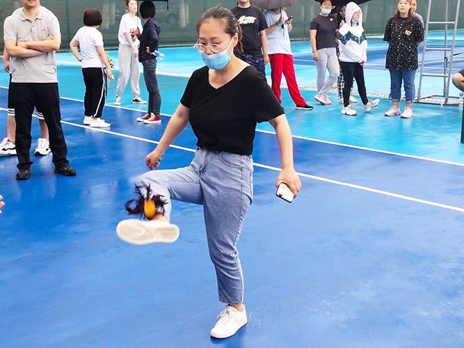 這是為女生們準(zhǔn)備的個人賽,同理,男生也可以挑戰(zhàn)。參加者每人一次機會,踢毽子在不間斷、不落地的前提下,個數(shù)*多者勝利。并且冠*可以直接去選一個獎品拿走。